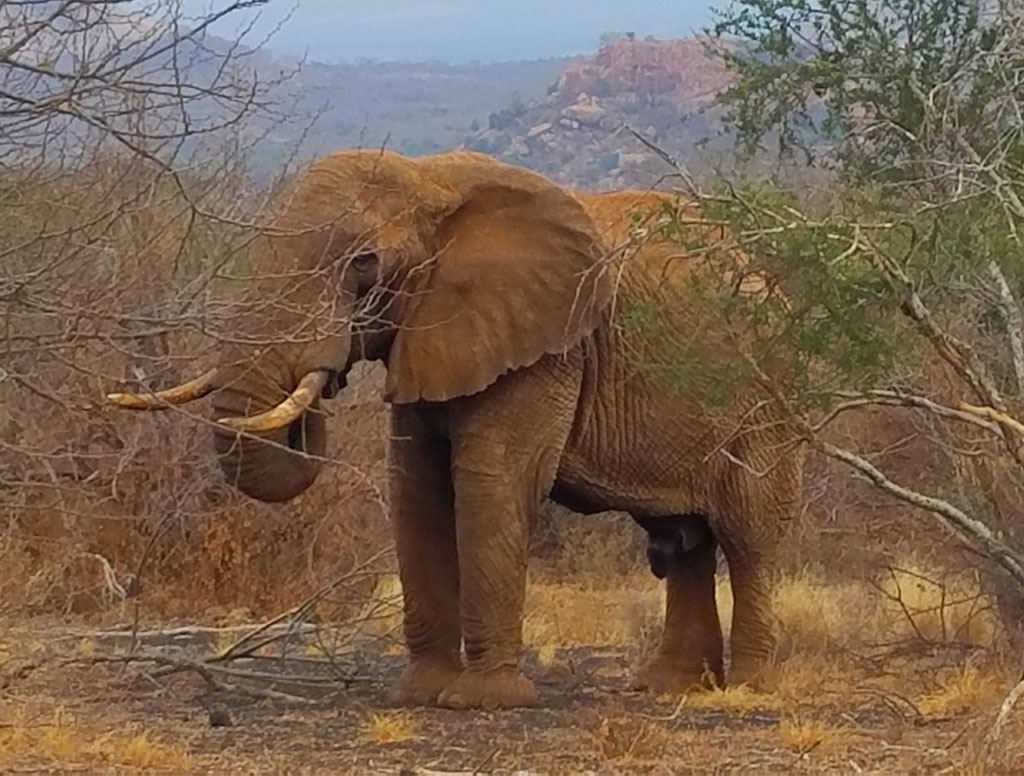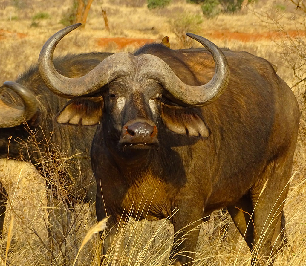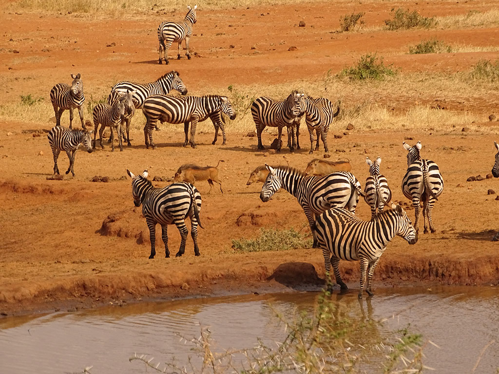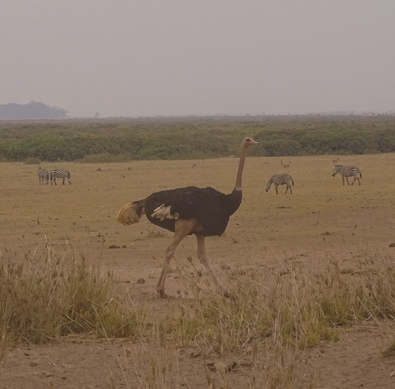 Tsavo West – Ronnie, our fabulous driver guide, picked us up at our Nairobi hotel the next morning. He would not only drive us to Tsavo West and Amboseli but would also be our safari guide while at the parks. He was a great driver, had a wonderful sense of humor, and was super knowledgeable about the animals and parks. We thoroughly enjoyed our time with him. Though it’s a bit of a drive out to Tsavo, we made it to the Kilaguni Serena Safari Lodge by about lunch time. It’s a large lodge with lots of open decks that look down on a watering hole. You just sit there, and the animals come to you! It almost seemed like the various herds had appointments. One herd would come, hangout, and then leave as another herd arrived. After lunch we went out on our first safari drive which ended with our first lion sighting. The next day was our full day in Tsavo West, and we did safari drives in the morning and afternoon. This is where we saw our first wild rhino, or more accurately, we got charged by our first wild rhino! But no fear, Ronnie knew what he was doing! By the time we left Tsavo, we had seen 4 of the Big Five animals. We were only missing the leopard, which (spoiler alert) would remain elusive throughout the whole trip.