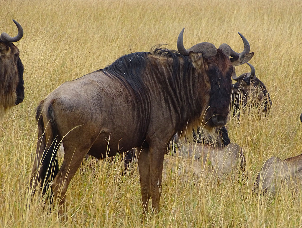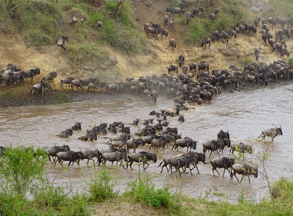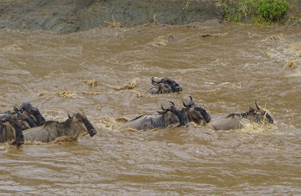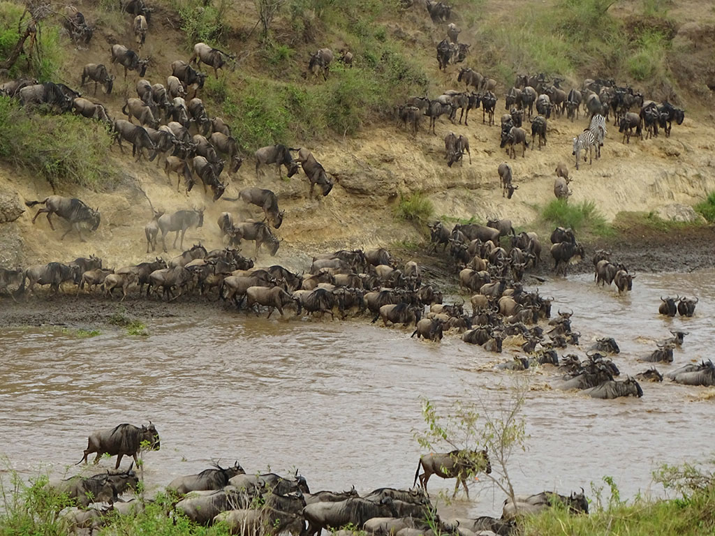 We were very lucky to catch a wildebeest migration event, and all credit goes to our driver guide who quickly got us to the correct place just as a herd was positioning themselves to cross the Mara River. All it takes is one wildebeest to make the leap, and then 1,000s more will follow. It was spectacular. They picked a good crossing point on this occasion. All seemed to make it across except for one baby that was too scared to jump and got left behind. 😦