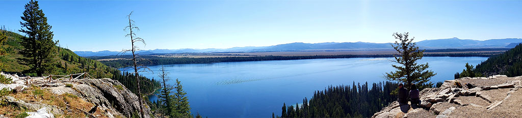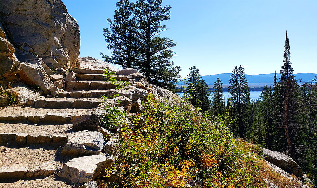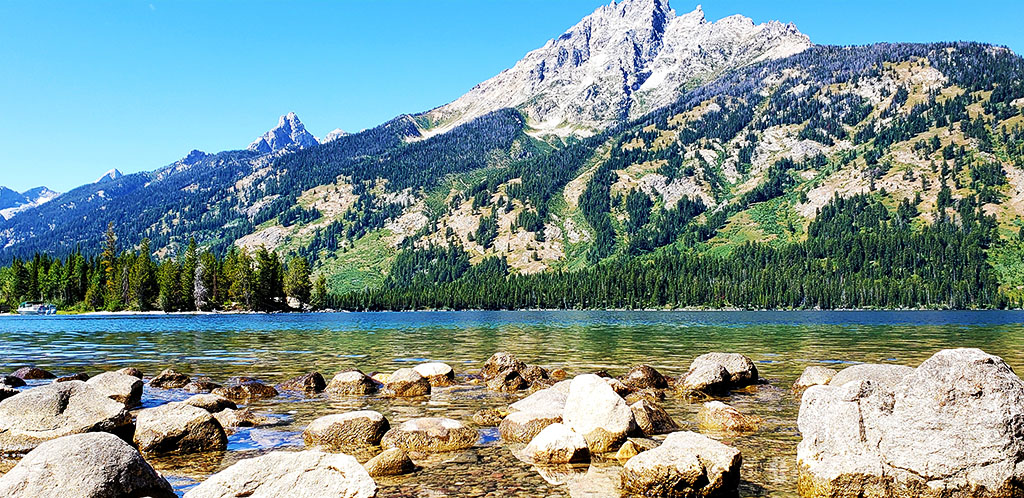 Grand Tetons – After breakfast the next morning, we drove out to the Lake Jenny area of the Grand Tetons, which took about 30 minutes. Lake Jenny is located at the bottom of the mountain range and is very picturesque. We got there early, and used our annual park pass to enter efficiently. (Note: The Lake Jenny parking area has clean bathrooms and small shops if you need water, snacks, or souvenirs.) We started by just wandering the lakefront. We then decided to pay a few dollars to take a boat to the other side where there are various hiking trails that lead to waterfalls and scenic viewpoints. We chose to go up to Inspiration Point, which offered a good hike and stunning views.